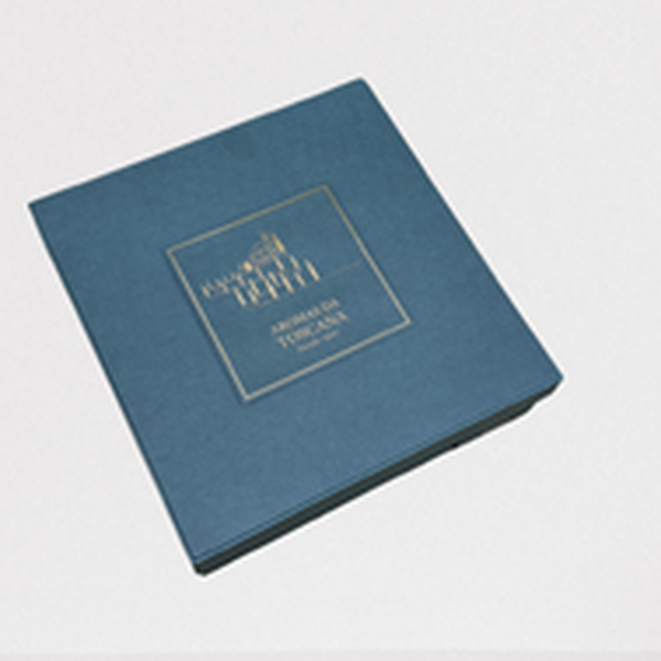 A Caixa Presente Essenza traz uma estética moderna com fundo escuro e aplicação dourada do selo Nesti Dante.